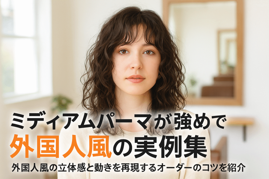 ミディアムパーマの強め外国人風スタイルは、近年注目を集めるトレンドの一つです。くるくるとした動きのあるウェーブや立体感が、欧米のファッションやヘアカタログで見かけるような抜け感を演出し、日本人にも似合いやすいスタイルとして人気です。また、強めのパーマは髪質が細い人や直毛の方でもしっかり動きを出せるのが魅力。ミディアムヘアならではのバランスの取れたボリューム感や、アレンジの幅広さも評価されています。「外国人風ミディアムパーマ強め」は特に30代~50代の女性や、トレンド感を重視するメンズにもおすすめです。