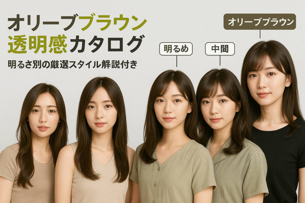 オリーブブラウンは、グリーン系の柔らかい透明感と上品さが魅力のヘアカラーです。色見本は明るさによって印象が大きく変わるため、自分に合ったトーン選びが大切です。下記の表は、オリーブブラウンの代表的な明るさ別の色見本を比較しています。